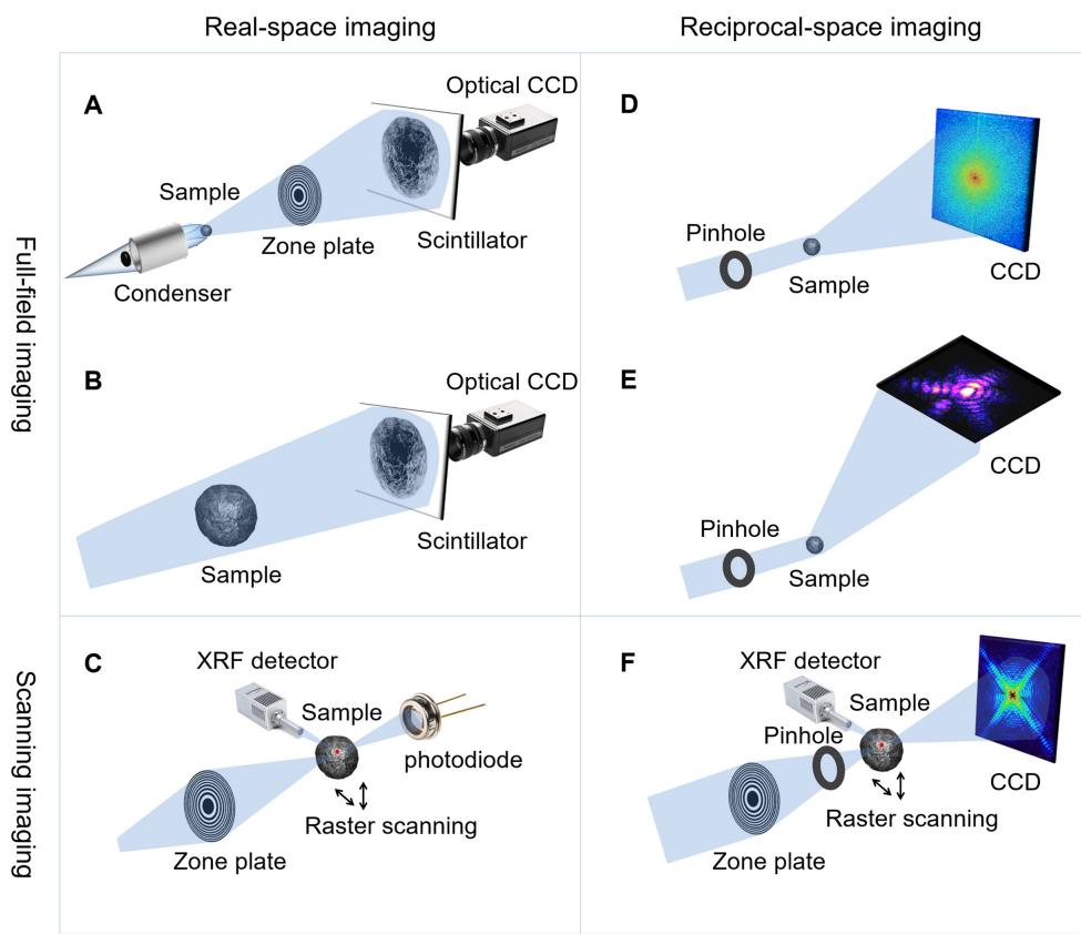 (A-B) 全场 TXM(实空间);© 扫描 STXM(实空间);(D-E) 衍射成像 CDI/BCDI(倒空间,全场);(F) 叠层成像 Ptychography(倒空间,扫描)。