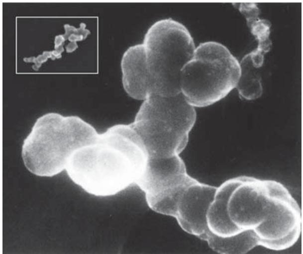 从电镜看,炭黑一次粒子多数接近球形,但真正影响材料“结构感”的是聚集体:一次粒子在生成过程中熔结在一起,界面边界往往不可分辨,形成链状或团簇状的三维结构(行业也称 aciniform)。聚集体进一步在气相或后续处理/运输过程中形成团聚体;团聚体可被剪切/研磨打散回聚集体,但聚集体本身不可再拆回单颗粒。