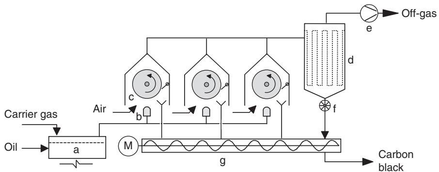 图2. Degussa 气黑工艺示意:汽化—燃烧—冷鼓沉积—刮取—过滤(原始图 10.27)