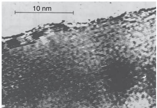 类石墨层内的 C—C 键合强度来自 sp² 杂化,层内形成类似石墨晶胞的聚集体。实际纤维结构相对于理想石墨更无序、更不完美,边缘、层片错排与层面弯曲等结构会引入局部 sp³ 成分。HR-TEM 在 1970 年代后使层内原子致密堆积与缺陷形貌更可见。