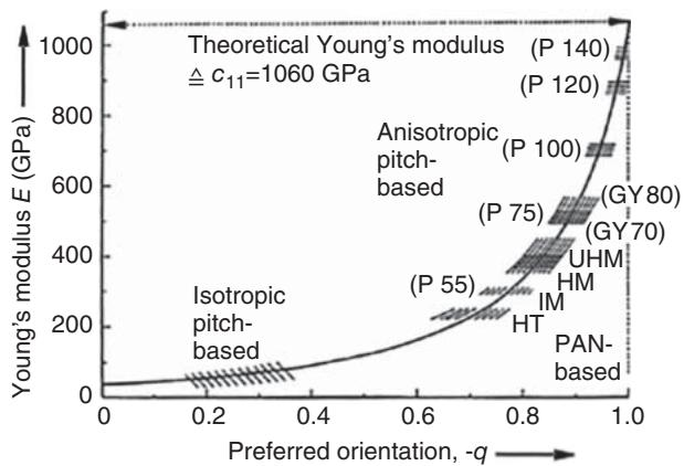 图3. 纤维取向度 q 与杨氏模量的关联:不同纤维类型的对比