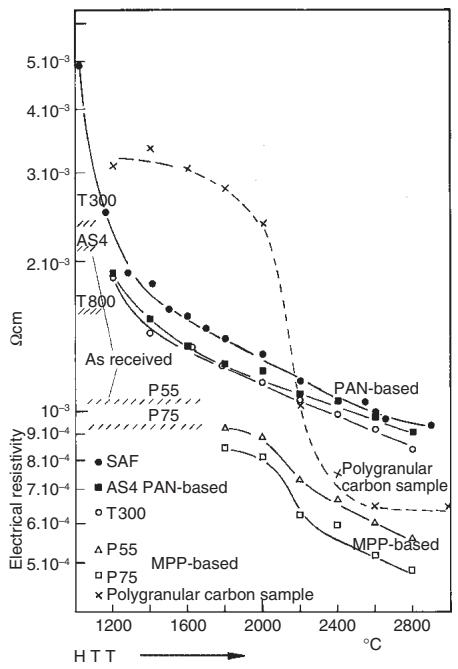 在石墨化温区内对碳纤维进行后处理,电阻率会体现出明显的体系差异:沥青基纤维的电阻率可降到比 PAN 基更低一个数量级,甚至低于合成石墨;PAN 基纤维即便在最高温区后处理后,仍不表现出可观的石墨化发展。