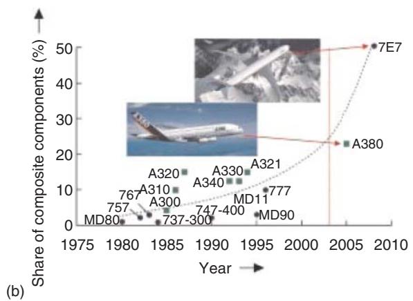 更高复材比例的飞机(例如 B787 与 A350)将机翼与机身的大结构件进一步纳入预浸料复材方案。军机与直升机(例如战斗机与多用途直升机)则更早、更深入地使用复合材料。