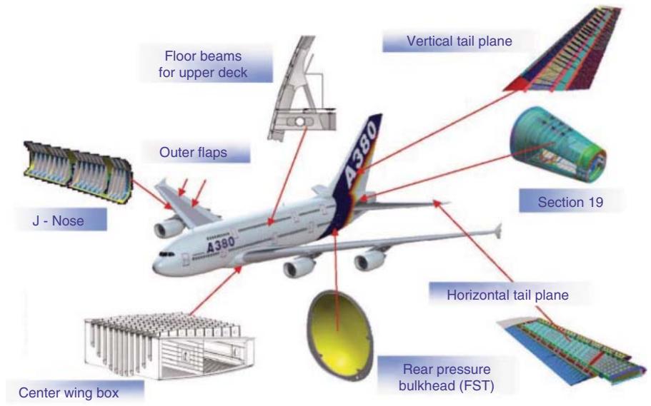 在民航领域,Airbus 作为长期创新引领者之一,从 A300 到 A380,复材应用范围持续扩大:水平尾翼、垂直尾翼、可动翼面、压力舱端盖、整流罩与后机身等部件逐步采用复合材料,重量占比已经超过 25%。