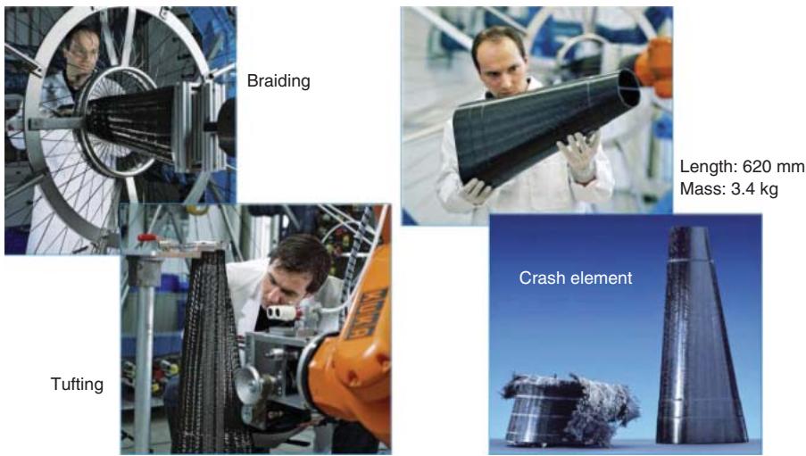 在高端车型中,复材已广泛用于车身结构与吸能部件。以编织/缝合为代表的纺织化预制体在吸能梁等部件中具有优势,既有更好的吸能特征,也有更高自动化潜力。