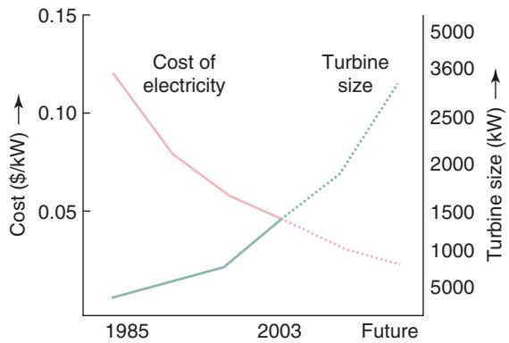 图5. 风电经济性受尺寸驱动的示意:叶片越大,对材料越敏感