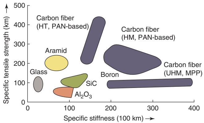 纤维的各向同性与各向异性,来自制造阶段是否进行拉伸取向。通过拉伸使类石墨层沿纤维轴向取向,可以显著提升拉伸强度与刚度。不同纤维体系的“单位质量强度/刚度”对比,能帮助把纤维选型从“材料牌号”拉回到“结构重量”尺度。