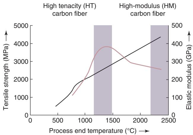 图3. 典型 PAN 基碳纤维的最终热处理温度与强度/模量关系