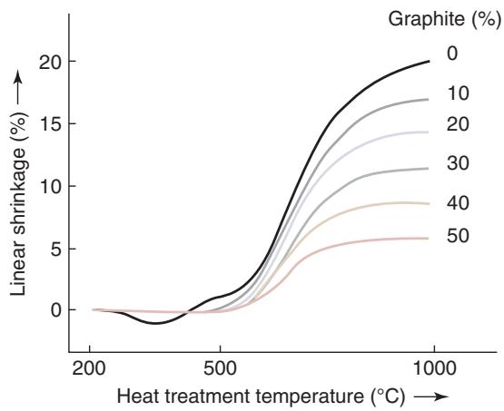 在树脂中加入填料可以减少首次热解阶段的收缩应力,从而降低残余应力和后续浸渍次数的需求。以约 2 μm 的石墨粉为例,可以观察到收缩行为的变化。