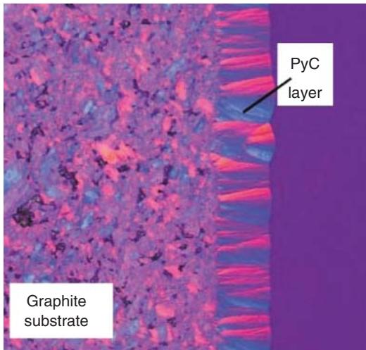 图6. 合成石墨基底上热解沉积碳涂层的典型结构(厚度约 30 μm)