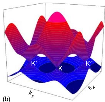 为什么说石墨烯载流子是线性色散? 因为能带在 K/K′ 点附近近似线性展开,导带与价带在这些点相接。