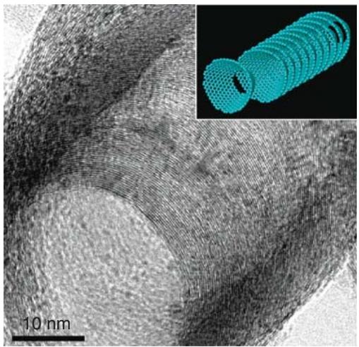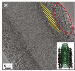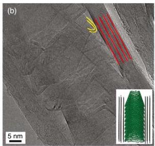 图1. 球磨后 CSCNT 的高分辨电镜图:倾斜视角下可见杯堆叠结构与示意模型