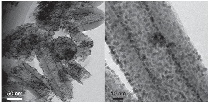图3. Pt 纳米颗粒在剪短 CSCNT 内外表面的高分散负载示例:低倍与高倍视场