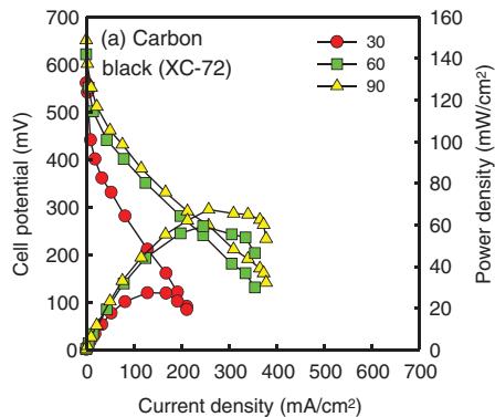 图4. DMFC 极化曲线对比:碳黑载体(XC-72)上 Pt–Ru 催化体系