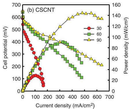 在燃料电池场景中,Pt–Ru 双金属也可被锚定在 CSCNT 上,典型粒径约 5 nm。以 DMFC 为例,在一个对比实验中,Pt–Ru/CSCNT 的功率密度约 145 mW/cm²,而传统碳黑载体(XC-72)上的 Pt–Ru 约 67 mW/cm²,显示出明显优势。