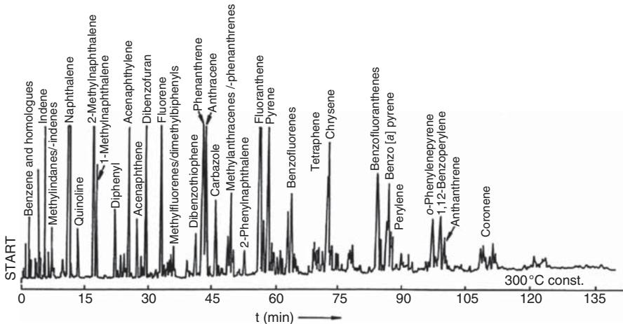 图1. 焦炉煤焦油气相色谱图谱示意,展示典型组分峰与含量量级