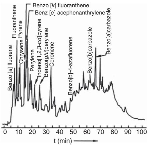 图2. 煤焦油沥青的高压液相色谱图谱示意,用于理解多组分与分子量分布