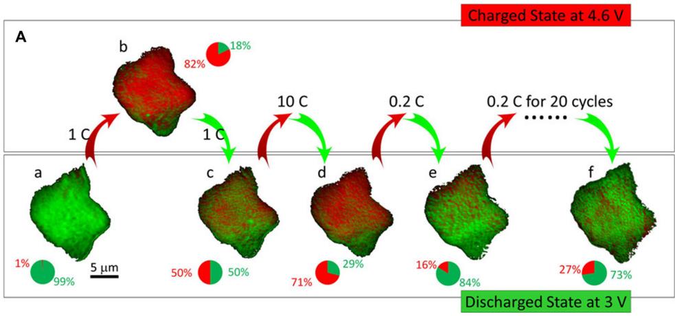 (A) 不同倍率下,颗粒内部相变(价态变化)的演变过程。