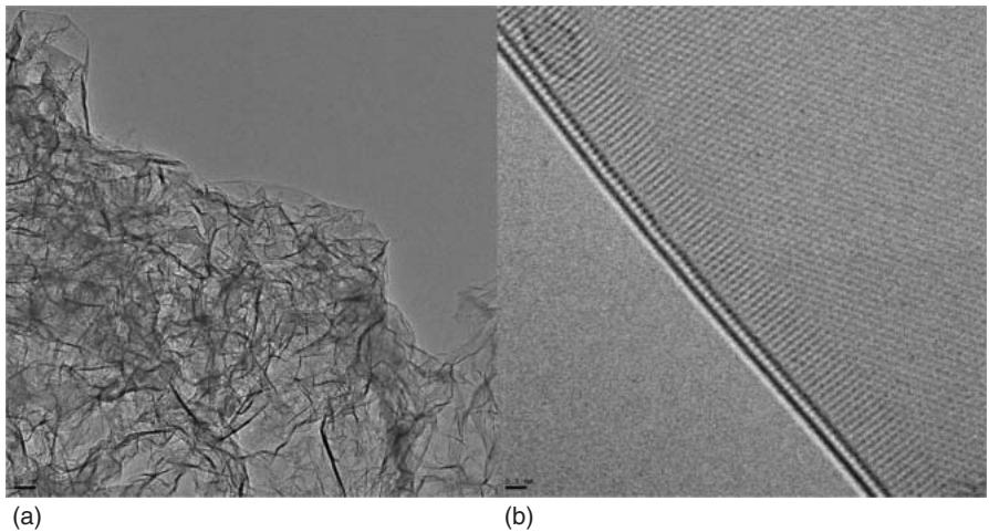 图1. 稻壳来源石墨烯的透射电镜图:低倍与高倍视场对照