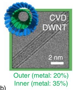 双壁体系的导电理解也在推进。双壁管可以通过两类路线制备:一类是使用铁/钼催化体系的 CCVD 路线;另一类是“豌豆荚”路线,把富勒烯 C60 装进单壁管后再进行约 1700°C 热处理形成双壁结构。