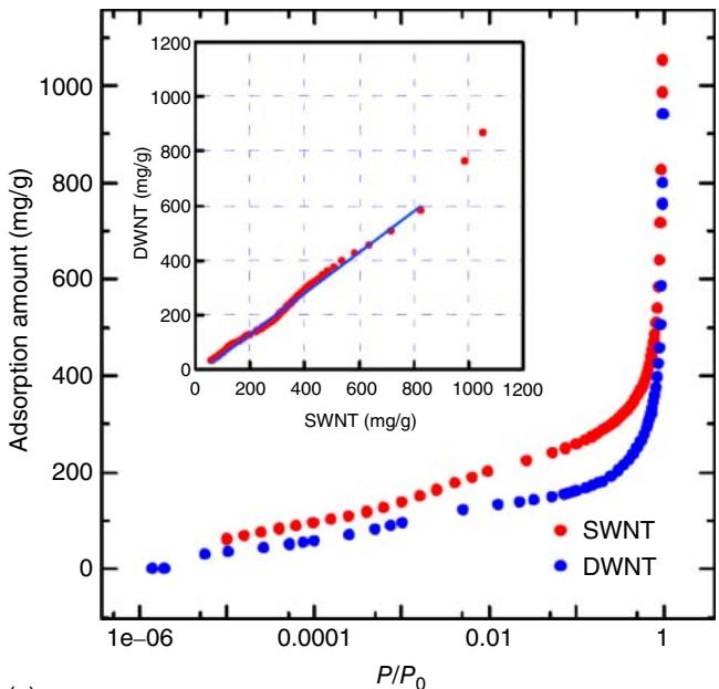 图8. 77 K 下单壁与双壁的氮气/氢气吸附等温线示意