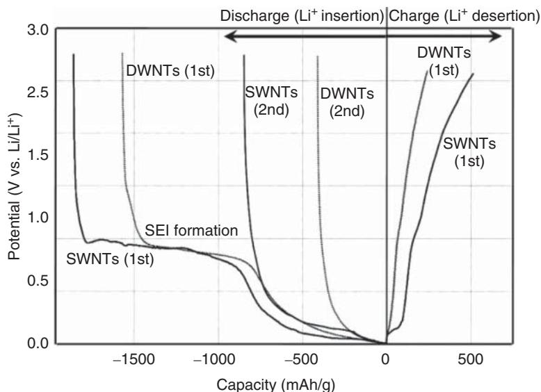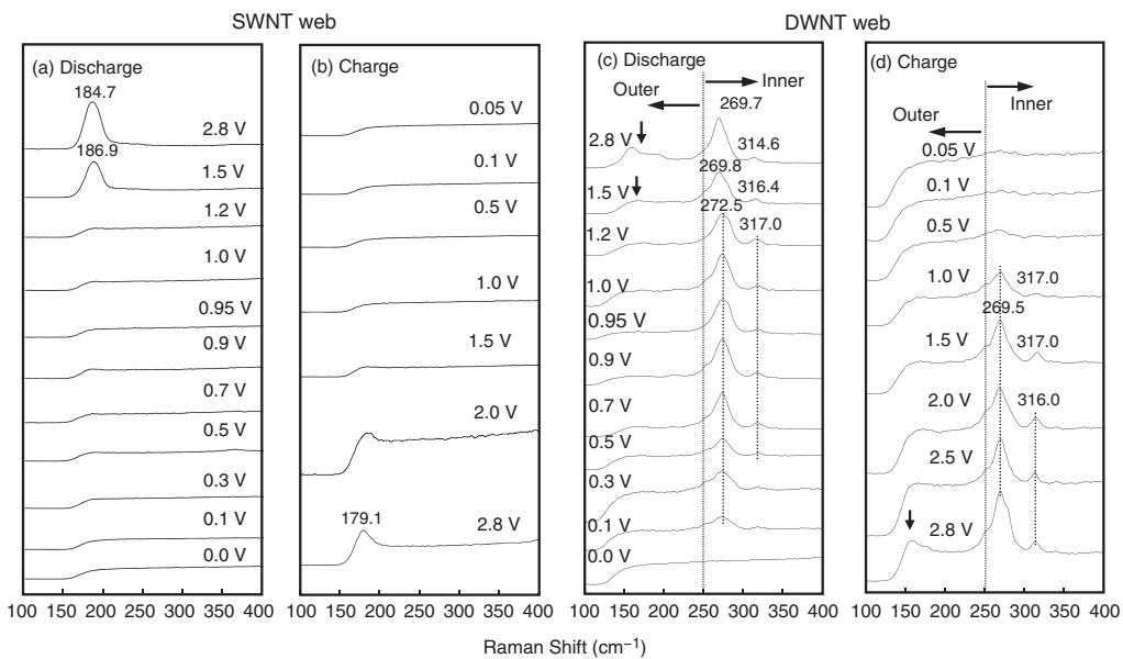 锂离子电池(LIB)可以把这些位点区分得很清楚。以单壁或双壁为负极组装扣式电池,并用原位拉曼跟踪锂离子插入过程时,插层位点可以落在束内缝隙、管内、外表面与层间空间。放电初段在 2.8–1.0 V 区间,锂离子主要在外表面参与存储;当电压进入 1.0–0 V 区间,束内缝隙位点的贡献开始明显。