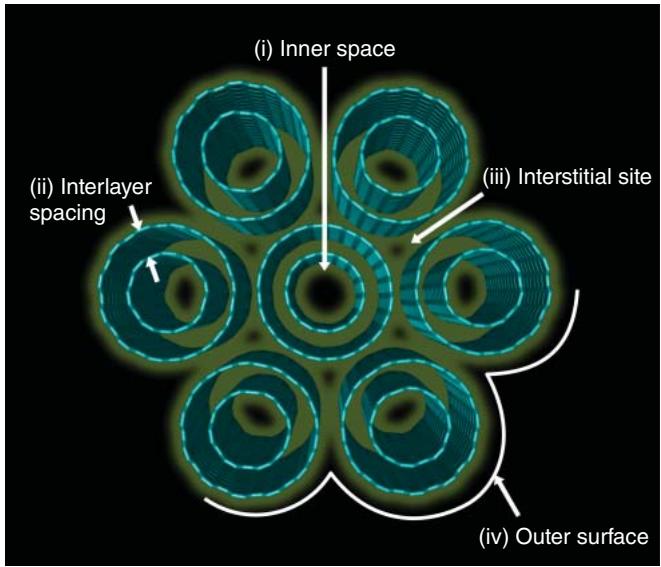 单壁与双壁都容易束化。把束内部的空隙按几何位置拆分,可以得到四类空间:管内腔体、双壁层间空隙、束内缝隙位点、以及束外表面。束内缝隙位点可以作为孔,容纳分子与离子。