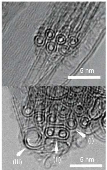 当温度进一步升高到 2200°C 以上,会出现新的 RBM 峰靠近 100 cm⁻¹,同时内层 RBM 变弱,提示直径发生变化。高分辨透射电镜可以看到并管过程:两根双壁的内外层可能同时并合形成更大直径结构;也可能出现类似双缆的结构,表现为两根单壁在更大外壳内并存。