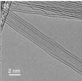 三壁碳纳米管(TWNT)可以通过在双壁体系上再“长一层”获得。常规合成中,小直径三壁管并不容易稳定得到。用 C60@DWNT 结构进行后续热处理时,封装的 C60 发生并合并形成第三层,是一种替代路线。高温条件下三壁体系的外层也会出现融合,硼参与时更容易发生。