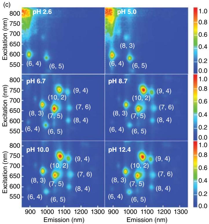 图37. 不同 pH 条件下 DNA 分散双壁的光致发光映射示意