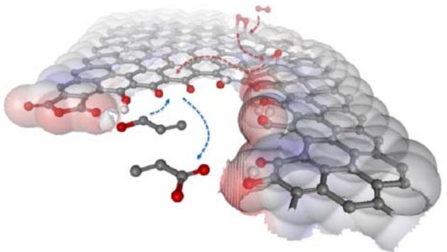 丙烯酸是重要化工原料。研究表明多类纳米碳对丙烯醛选择氧化表现出活性,其中结构更有序的 sp² 纳米碳(MWCNT、OLC)更容易获得更好的稳定性、活性与选择性。机理图景可概括为:丙烯醛先在碳表面发生解离吸附,随后在亲水含氧位点与缺陷处活化 O₂,并通过环氧等可迁移氧参与表面反应生成丙烯酸。