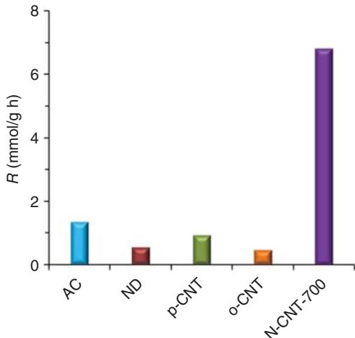 在烯丙醇选择氧化为丙烯醛体系中,含氧官能团并不表现为主要贡献来源;相反,掺氮 碳纳米管(CNT,NCNT)往往更活跃,且活性随石墨型氮含量增加而提高,指向“电子结构调控氧与底物吸附/活化”的路径。